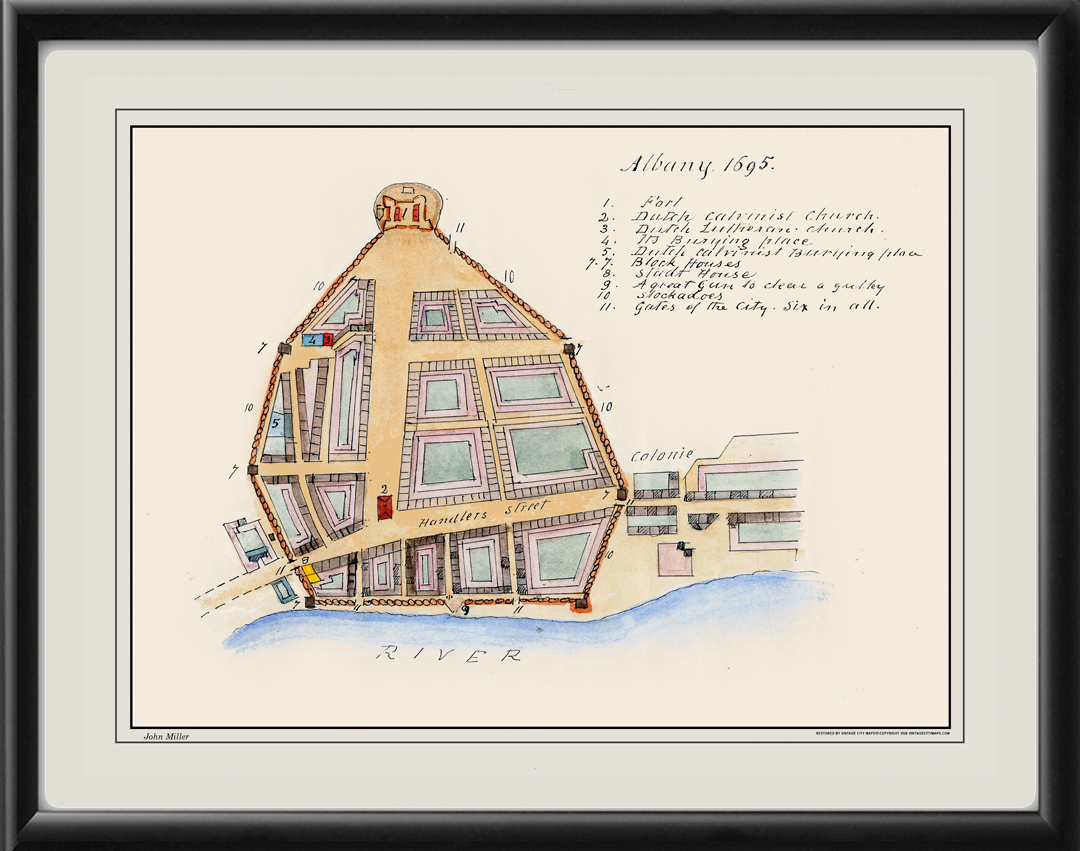 Restored bird’s eye view plan of the city of Albany, New York, 1695 by John Miller