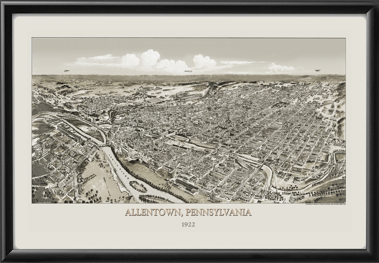 Restored bird’s eye view map of Allentown, Pennsylvania, 1922 by Thaddeus Mortimer Fowler.