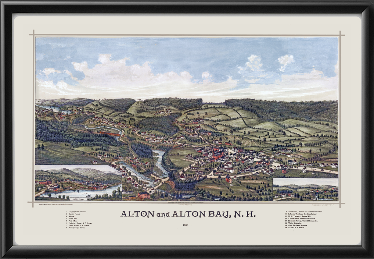 Restored bird’s eye view map of Alton and Alton Bay, New Hampshire, 1888 by George Norris.
