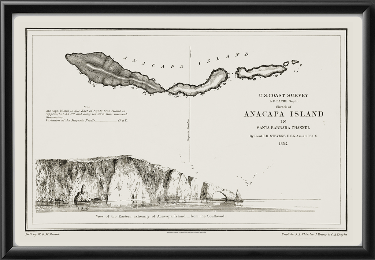 Restored survey map of Anacapa Island in Santa Barbara Channel, California, with a view of the eastern extremity from the southward, 1856 by William Birch McMurtrie