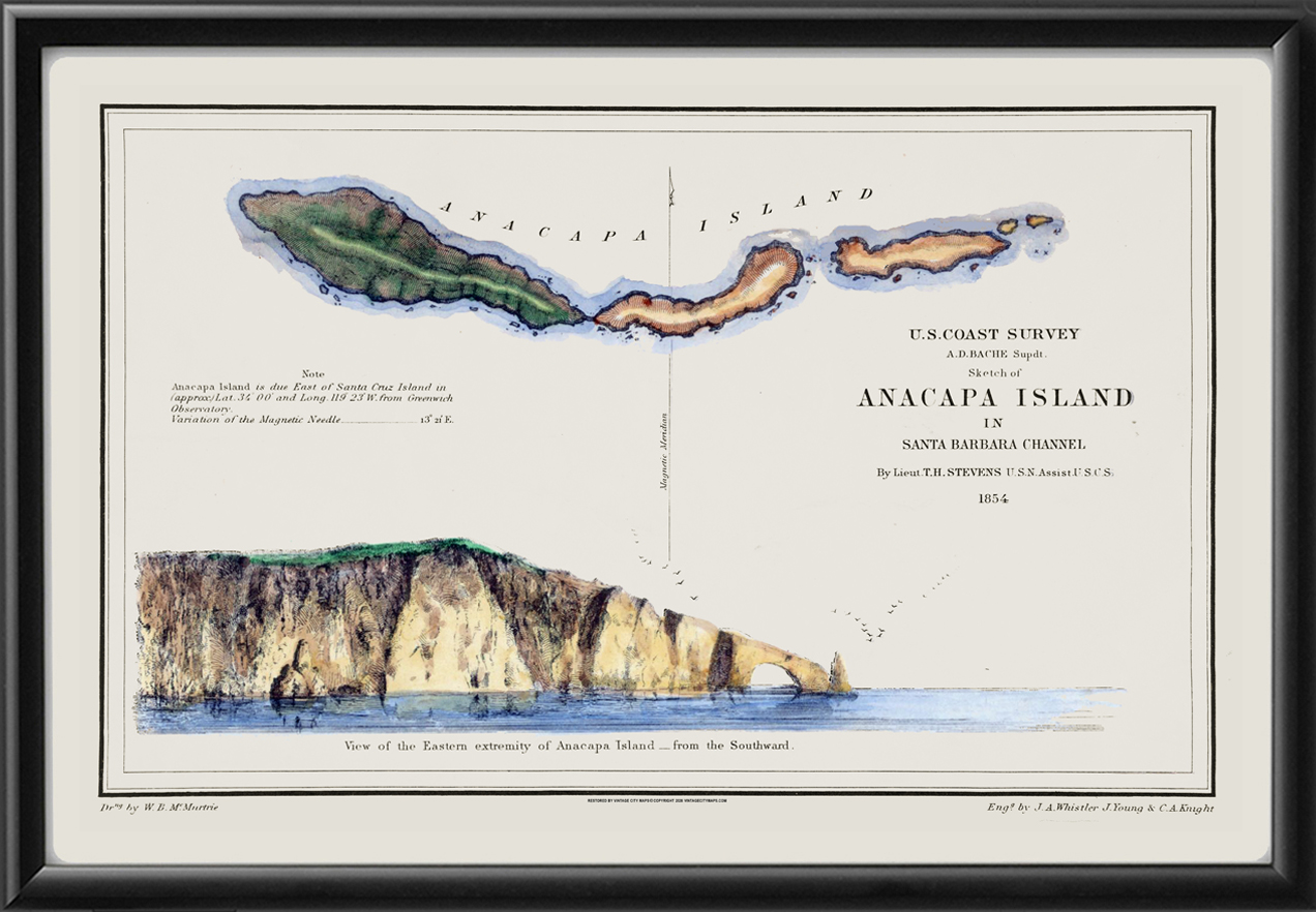 Restored survey map of Anacapa Island in Santa Barbara Channel, California, with a view of the eastern extremity from the southward, 1856 by William Birch McMurtrie