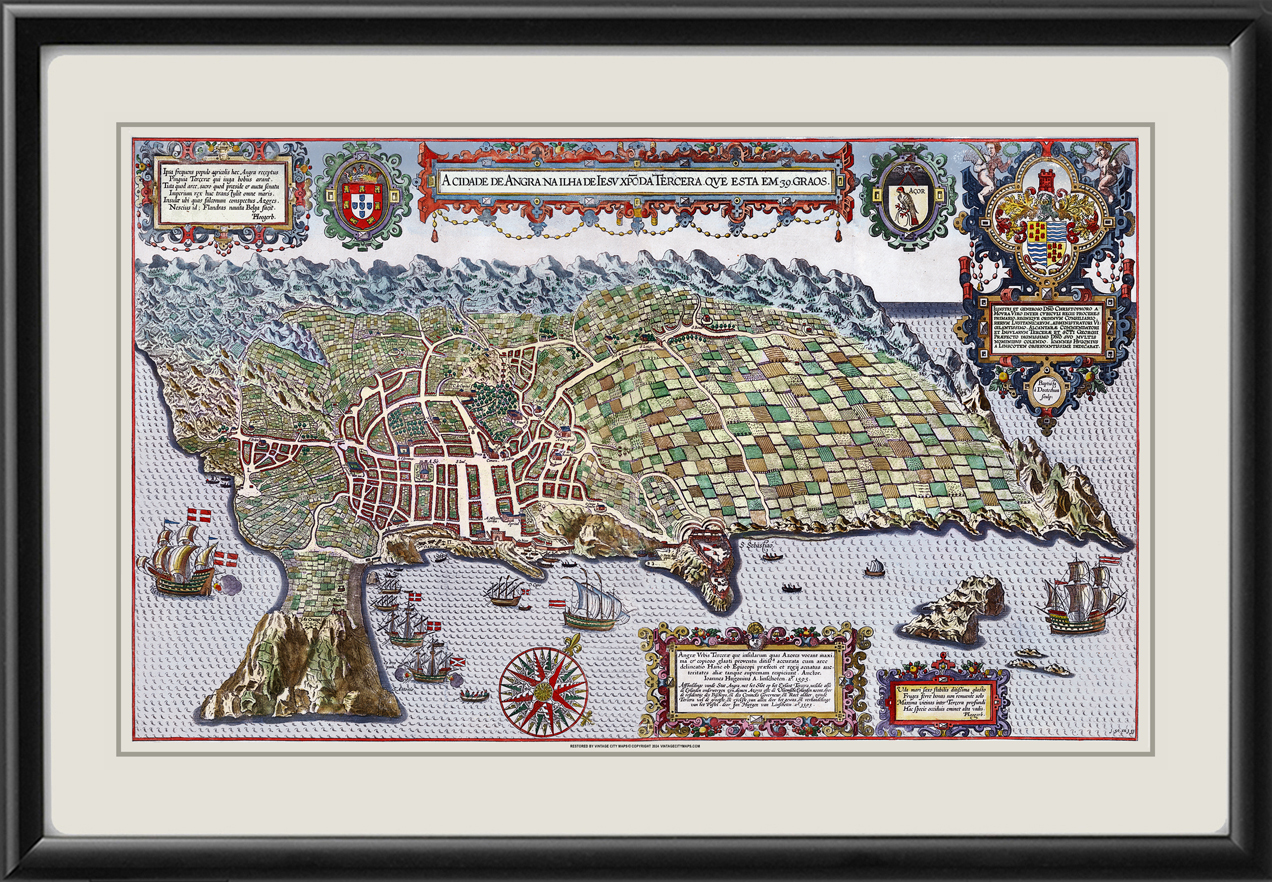 Restored panoramic bird’s eye view and plan of the city of Angra on the island of Terceira in the Azores, engraved by Baptista van Doetecum and based on the travels of Jan Huygen Van Linschoten, 1595