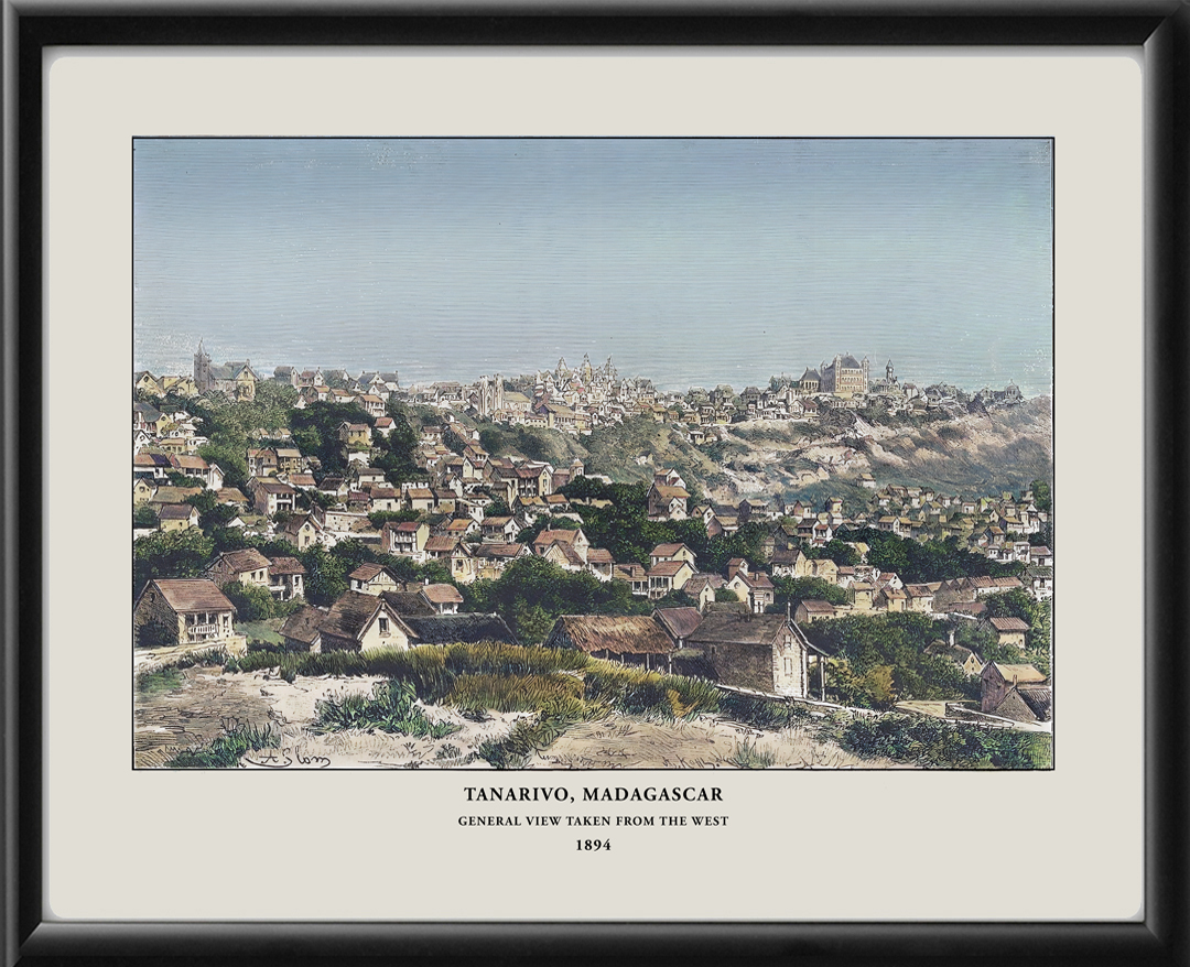 Restored bird’s eye view of Antananarivo (Tanarivo) Madagascar, 1894 taken from the west by Jean Jacques Élisée Reclus