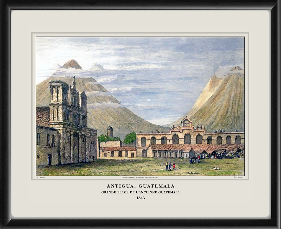 Restored bird’s eye view of Antigua, Guatemala, the ancient capital, 1843 – “Grande Place De L´Ancienne Guatémala” – Original steel engraving, painted by Augustin Francois Lemaitre and engraved by Leon Gaucherel