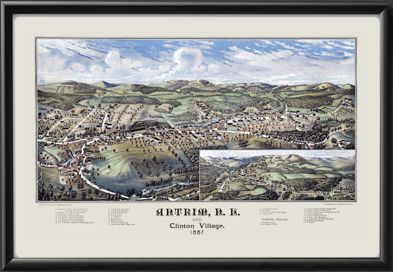 Restored bird’s eye view map of Antrim and Clinton Village, New Hampshire, 1887 by George Norris.