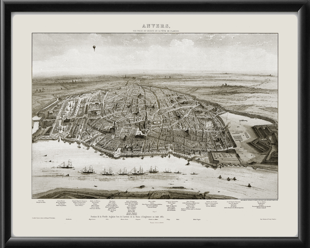 Restored bird’s eye view map of Antwerp, with the location of the English fleet on the arrival of the Queen of England in 1852 by François Stroobant.