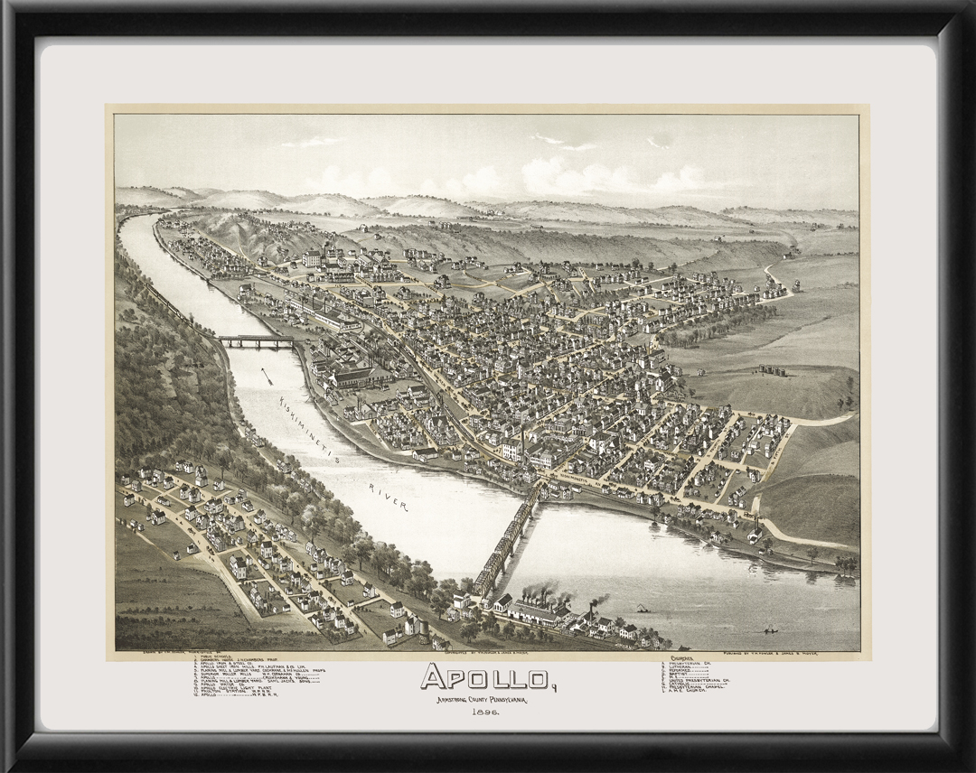 Restored bird’s eye view map of Apollo, Pennsylvania, 1896 by Thaddeus Mortimer Fowler.
