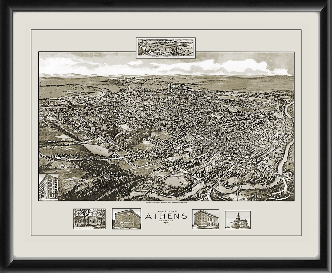 Restored bird’s eye view of Athens, Georgia, 1909 by Albert E. Downs