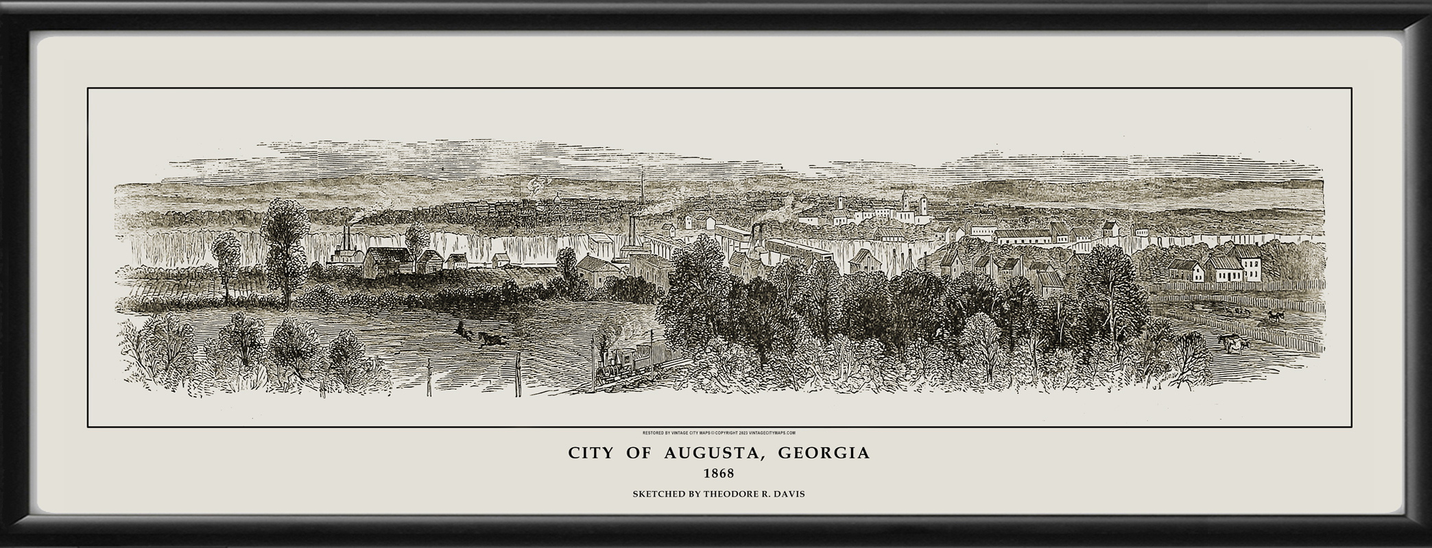 Restored panoramic view of Augusta, Georgia, 1868, from the original engraving by Theodore R. Davis published in Harpers Weekly.