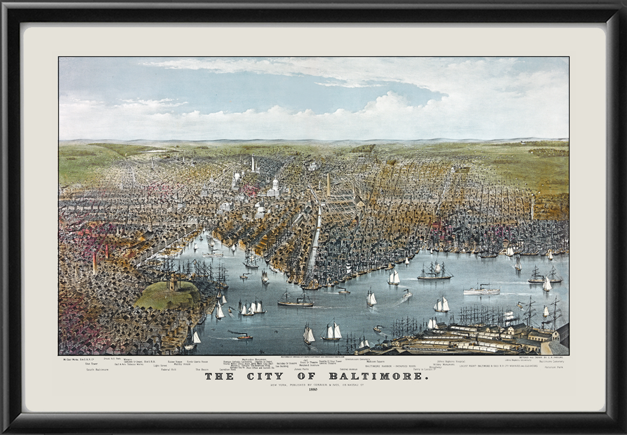 Restored bird’s eye view map of Baltimore, Maryland, 1880 by Charles Parsons, published by Currier & Ives.