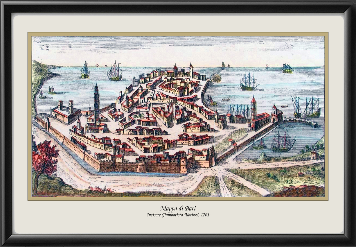Restored bird’s eye view of Bari, Italy in The Kingdom of Naples, 1761 by Giambatista Albrizzi.