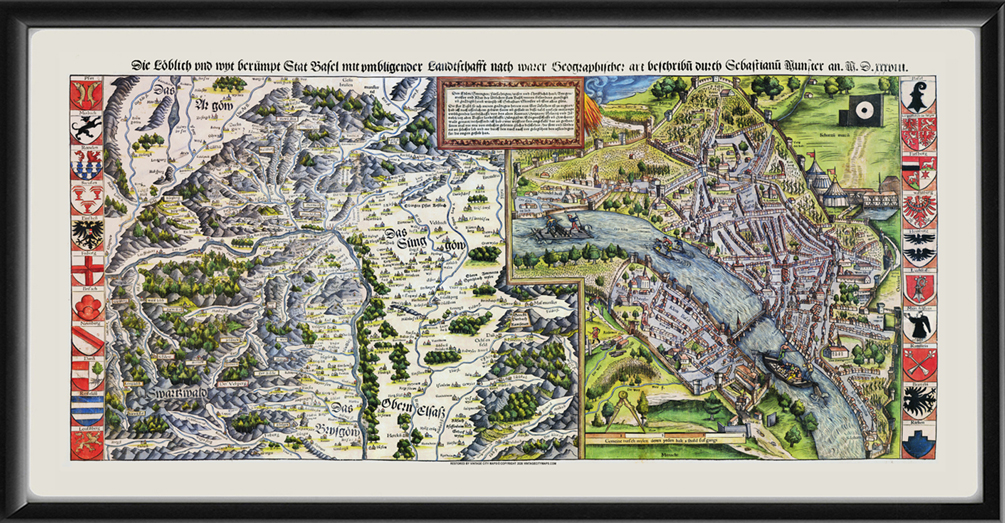Restored bird’s eye view map of Basel, Switzerland and vicinity, 1538 by Sebastian Munster