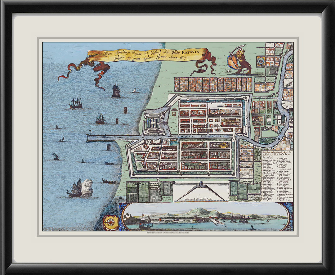 Restored bird’s eye view map of Batavia, Dutch East Indies (Jarkarta, Indonesia), 1669 by Clement de Jonghe.