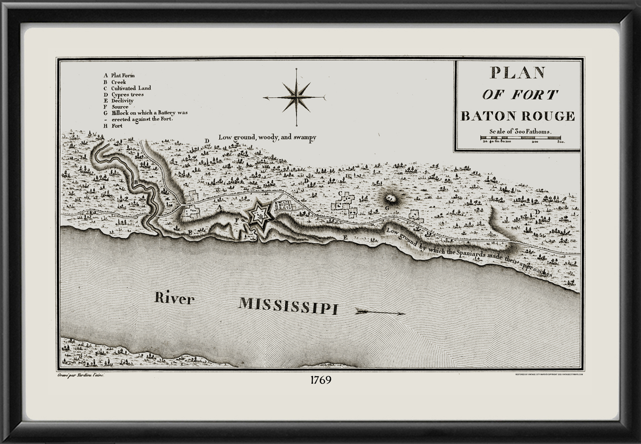 Restored plan of Baton Rouge, Louisiana, 1769 (then Spanish West Florida) by French Cartographer and spy Victor George Henri Collot