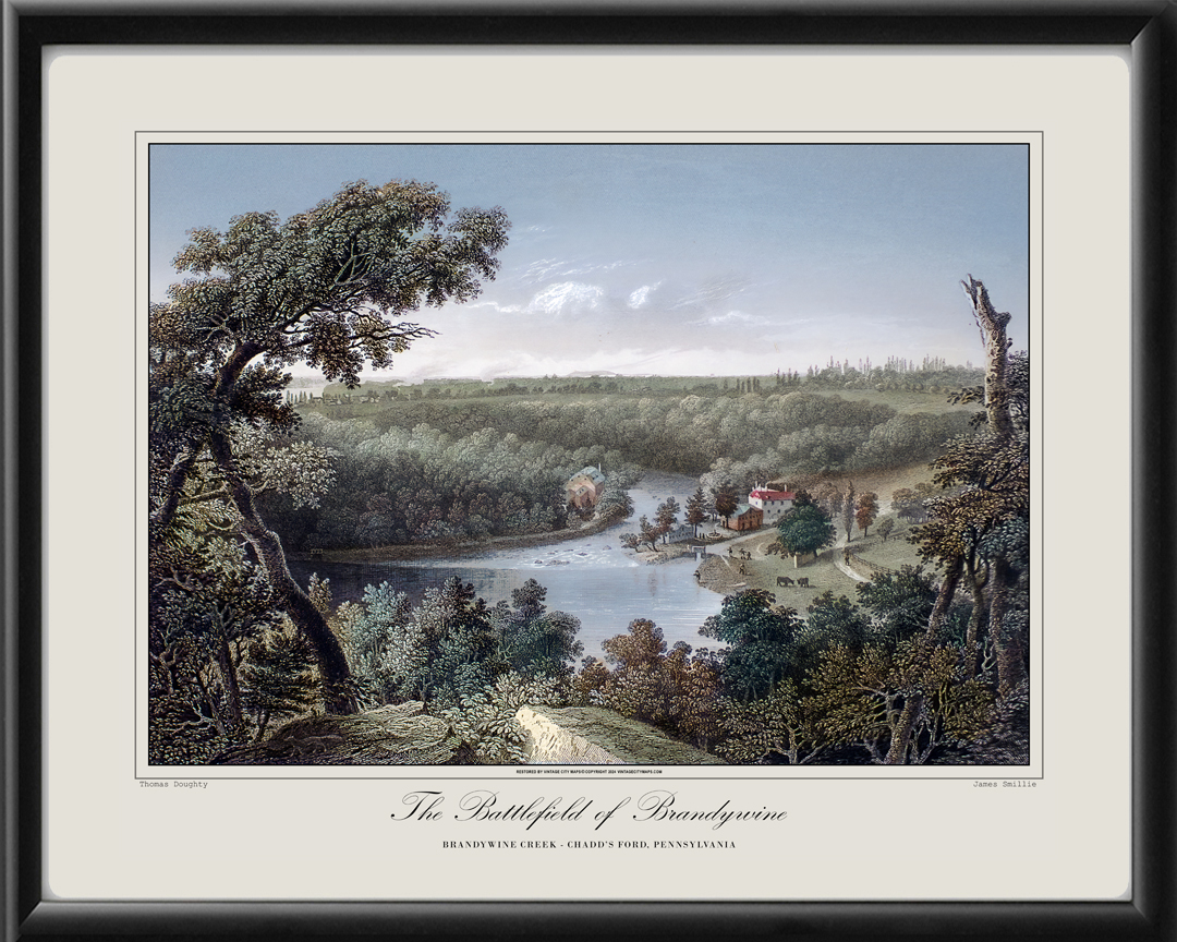 Restored 1830 bird’s eye view of the scenery of the Battlefield of Brandywine, near Chadd’s Ford, Pennsylvania, the site of the famous Battle of Brandywine Creek between the British Army and George Washington’s Colonial Army, by James Smillie & Thomas Doughty