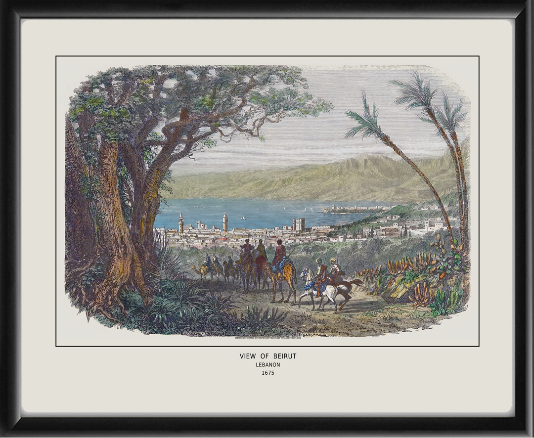 Restored bird’s eye view of Beirut, Lebanon on the Mediterranean Sea, 1675 from the original engraving, drawn by Pierre Eugene Grandsire and engraved by Alfred Louis Sargent