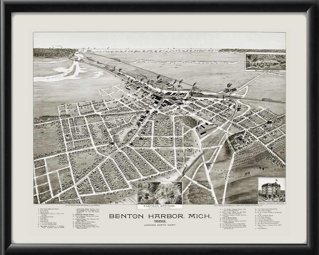 Bird’s eye view map of Benton Harbor MI 1889 by C.J. Pauli