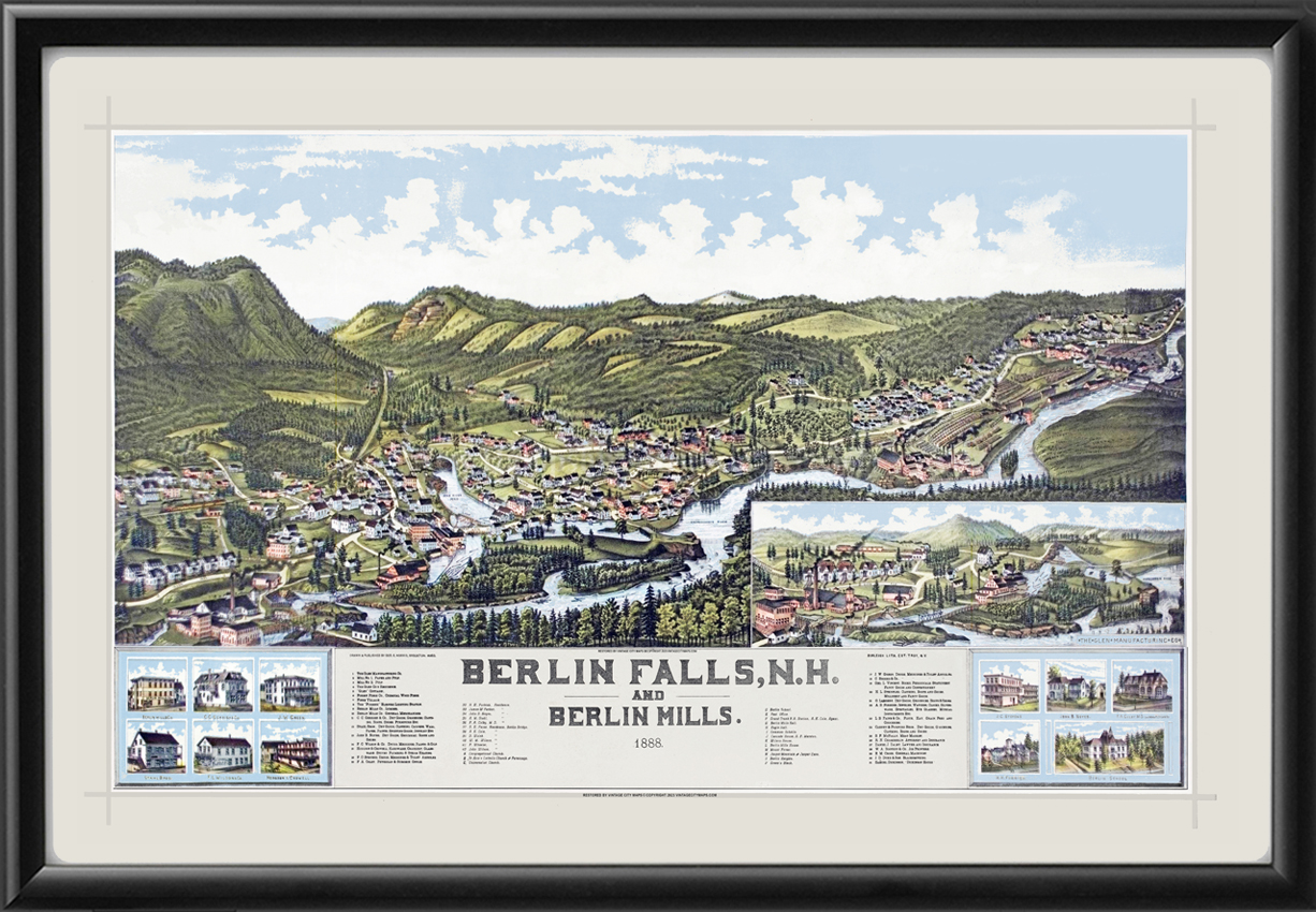 Restored bird’s eye view of Berlin, New Hampshire, 1888 (color version) by George Norris, showing Berlin Falls and Berlin Mills.