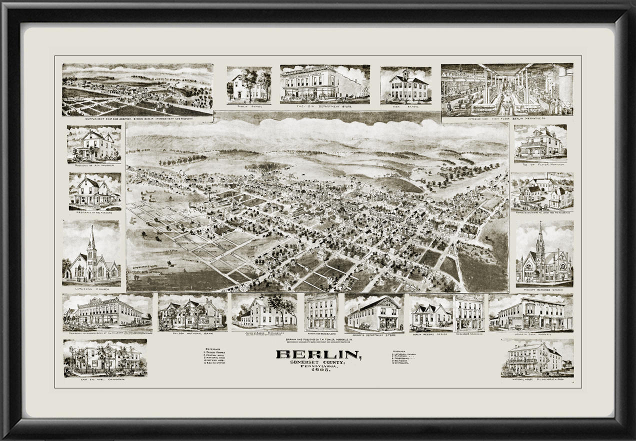Restored bird’s eye view map of Berlin, Pennsylvania, 1905 by Thaddeus Mortimer Fowler.