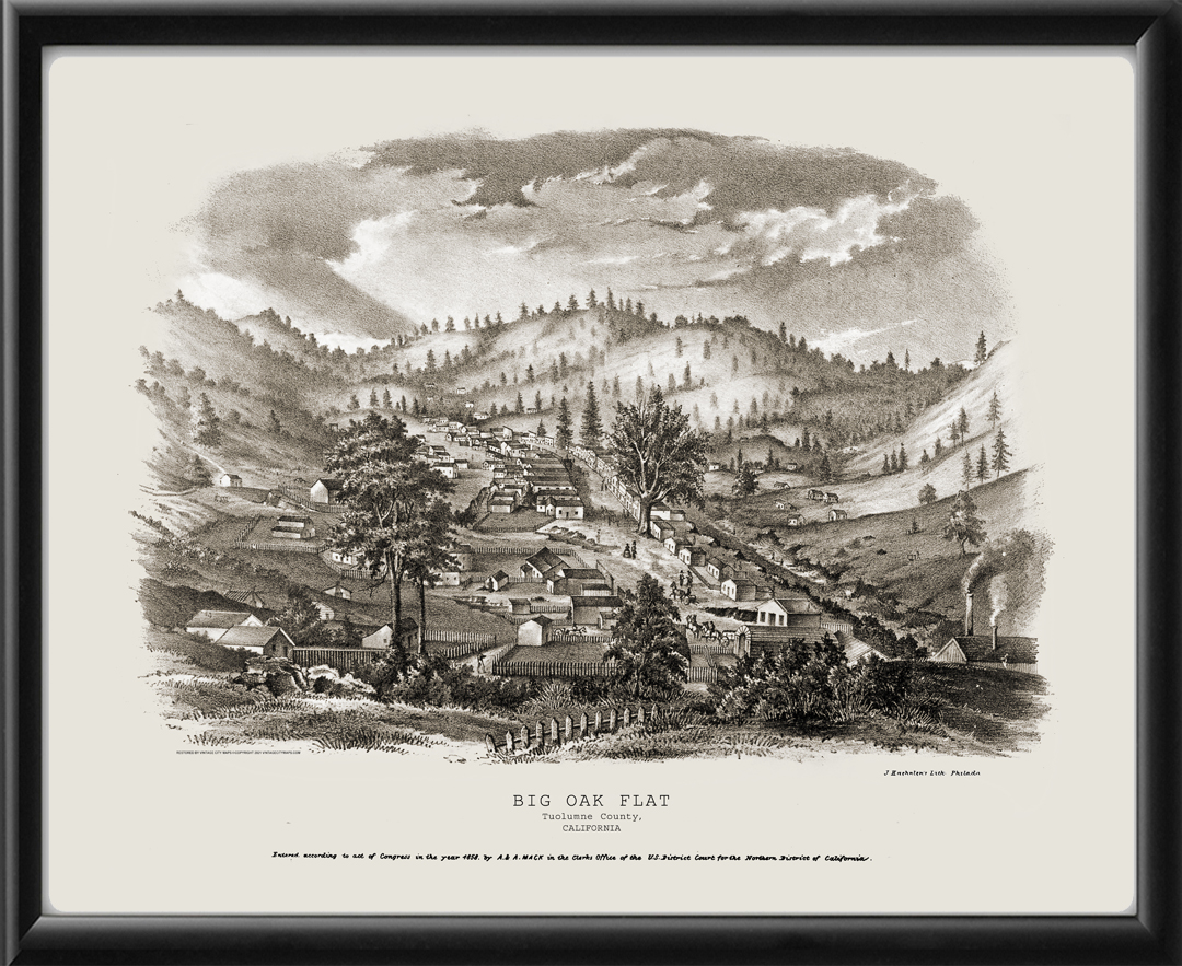 Restored bird’s eye view of Big Oak Flat, California, 1858 by A. & A. Mack.