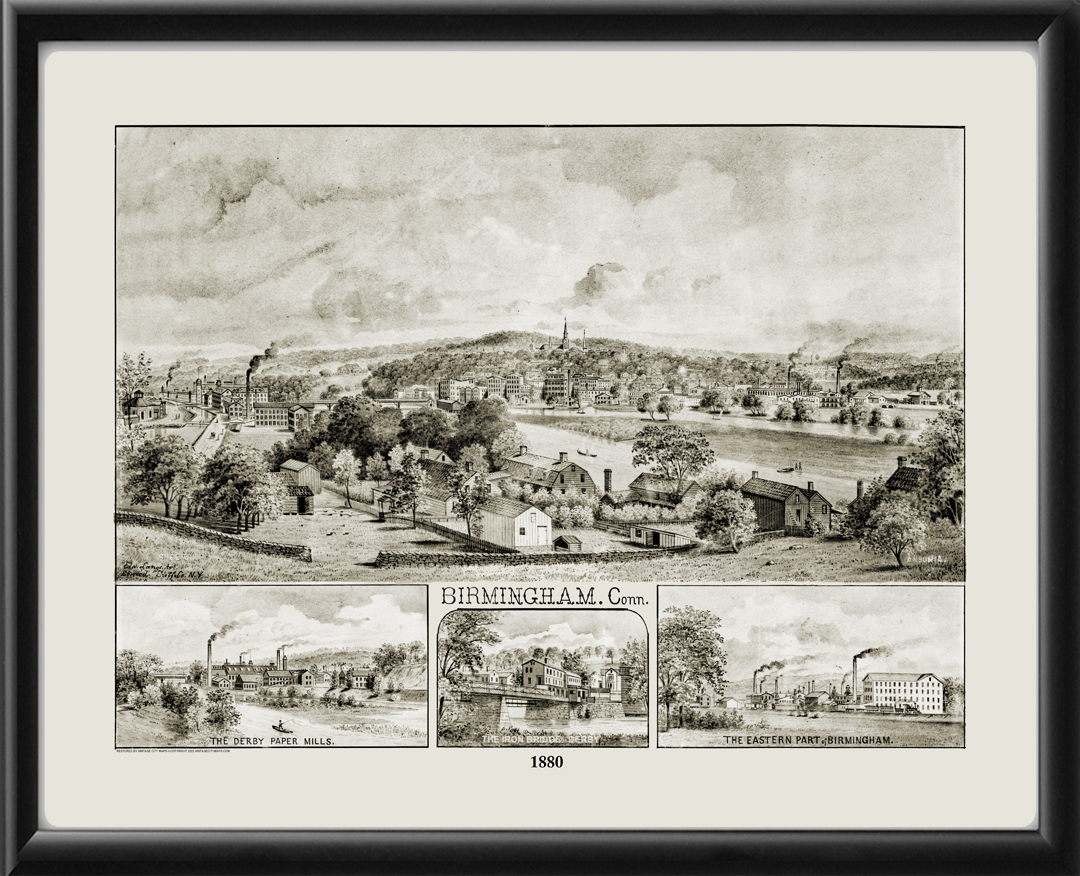 Restored bird’s eye view of Birmingham (Derby), Connecticut, 1880 by Edward Lange, located at the confluence of the Housatonic and Naugatuck Rivers. Additional scenes include The Derby Paper Mills, the iron bridge, and the towns of Shelton and Ansonia.