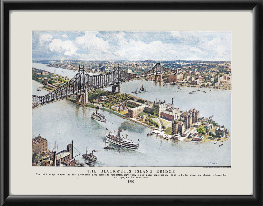 Restored bird’s eye view of Blackwell’s Island and bridge, now Roosevelt Island and Queensborough Bridge (color version), 1902 by H. M. Pettit, originally published in Harper’s Weekly.