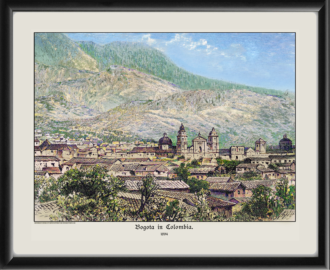 Restored panoramic view of Bogota, Colombia from the original wood engraving published in 1894.