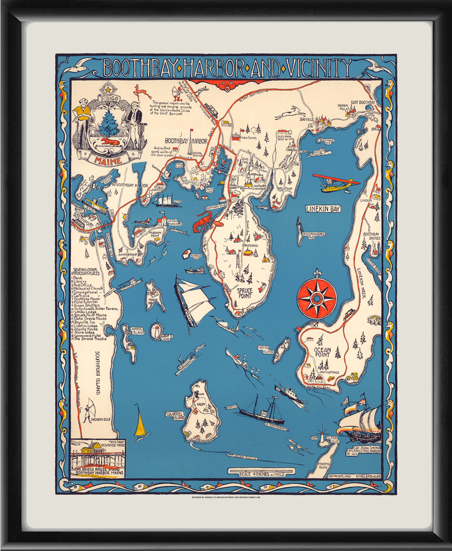 Restored pictorial bird’s eye view map of Boothbay Harbor and Vicinity, showing buildings, lighthouses, boats, ships, roads, historical buildings, and Indian trail, 1931 by Ethel B. Fowler