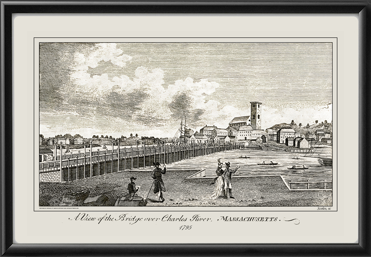 Restored bird’s eye view of the bridge over the Charles River, Boston, Massachusetts, 1795 from the original engraving by Charles Scoles
