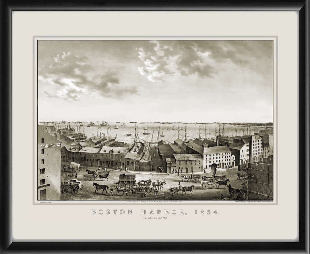 Restored bird’s eye view of Boston Harbor, in Boston, Massachusetts as viewed from Fort Hill, 1854 by John White Allen Scott