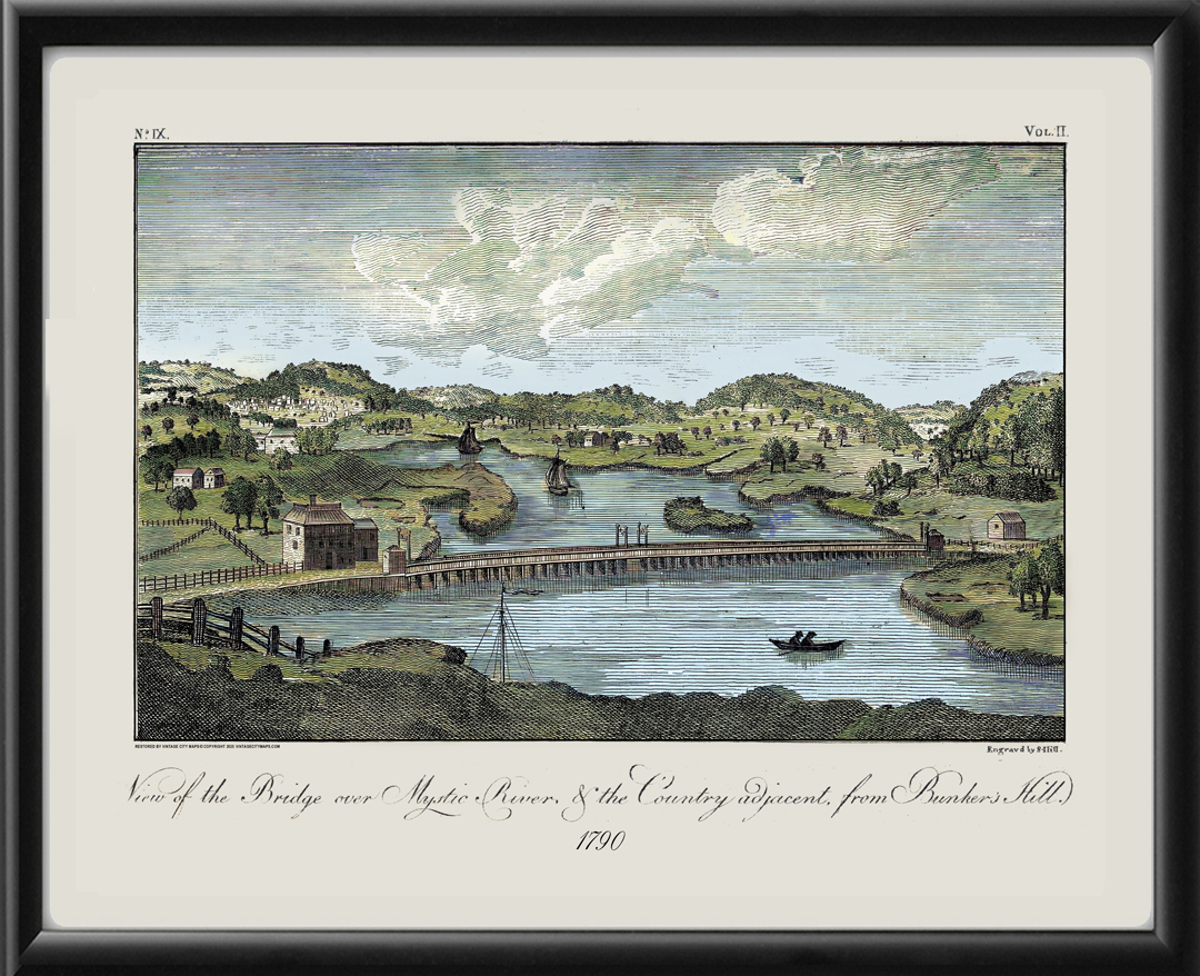 Restored bird’s eye view of view of the Bridge over Mystic River and the adjacent area from Bunker Hill, Boston, Massachusetts from the original engraving by Samuel Hill.
