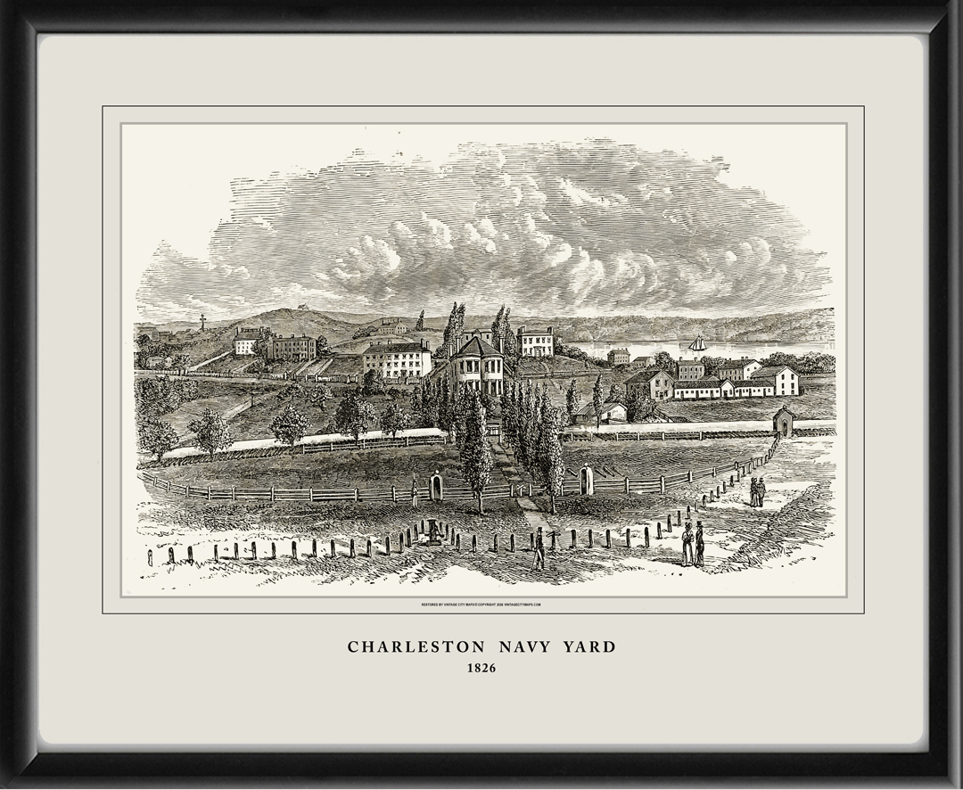 Restored bird’s eye view of the Charlestown Navy Yard, Boston, Massachusetts showing Bunker Hill, from the original 1826 engraving