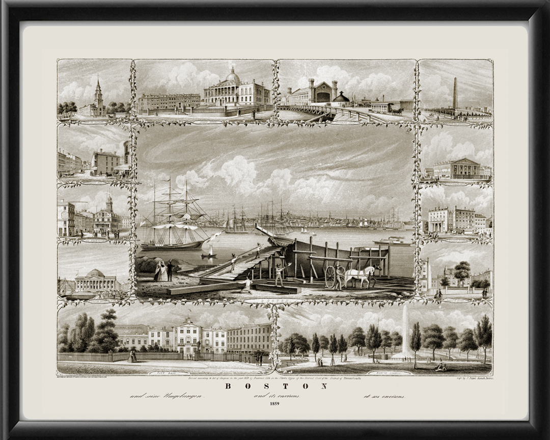 Restored views of Boston, Massachusetts, 1859, engraved by Johann Poppel, including inset views of City Hall, Boston Common, buildings and institutions.