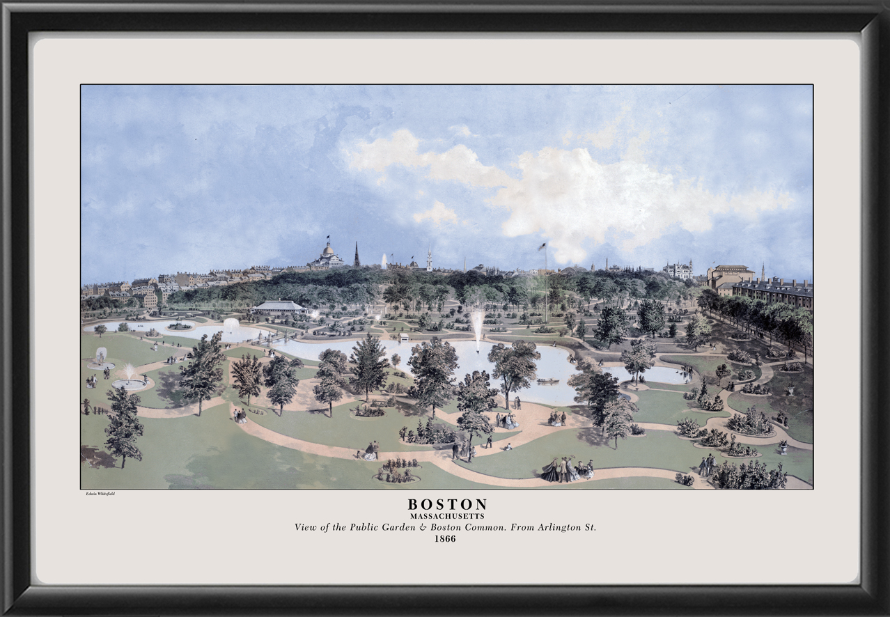Restored panoramic view of the Public Garden & Boston Common, from Arlington St., 1866 by Edwin Whitefield.