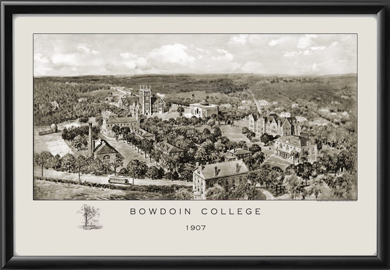 Restored bird’s eye view of Bowdoin College in Brunswick, Maine, 1907 by H.D. Nichols.