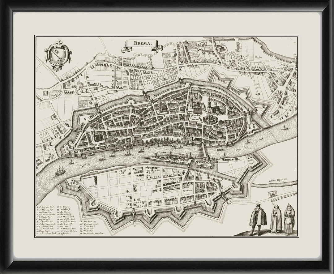 Restored bird’s eye view of Bremen, Germany 1653 by Matthaeus Merian and Martin Zeiller