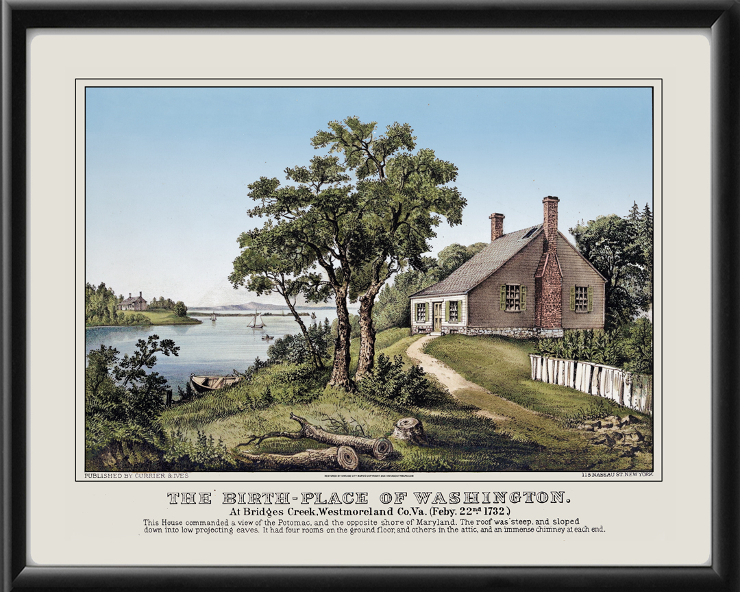 Restored view of George Washington’s Birthplace, at Bridges Creek in Westmoreland County, Virginia, originally published in 1876 by Currier & Ives