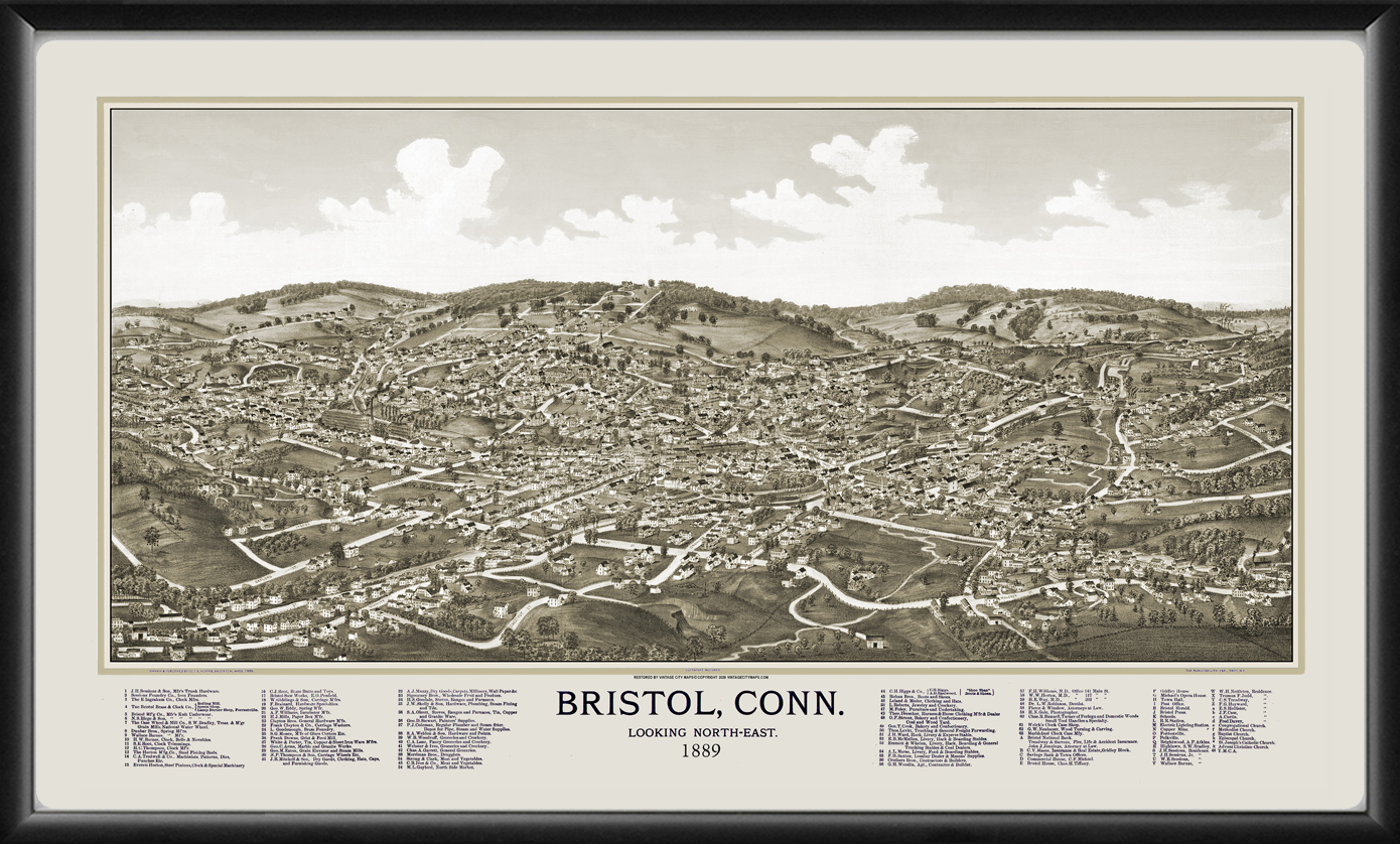 Restored bird’s eye view map of Bristol, Connecticut, 1889 by George Norris.