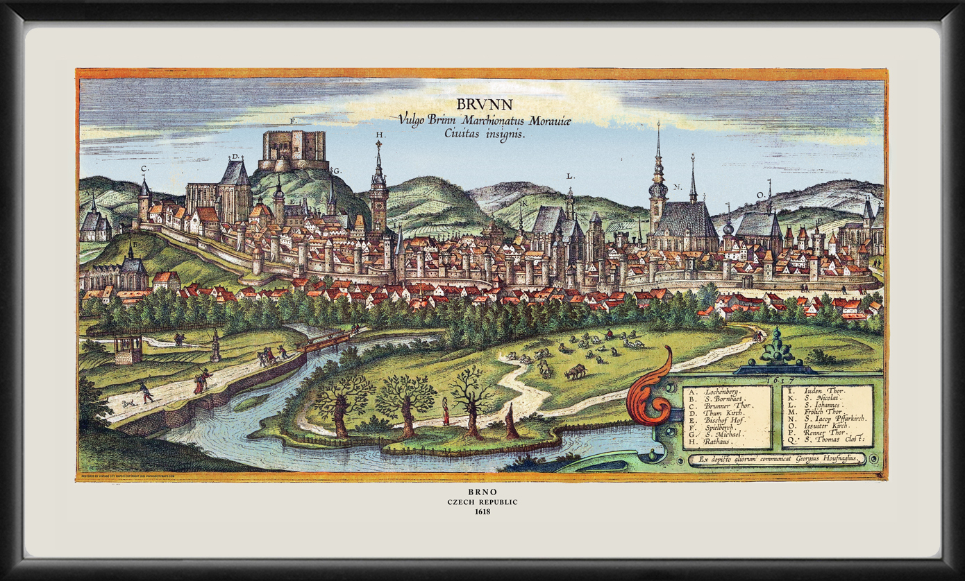 Restored bird’s eye view of Brno (Brünn), former capital of Moravia, Czech Republic by Flemish Painter Joris Hoefnagel, published in 1618 by Georg Braun and Franz Hogenberg in their atlas, “Civitates Orbis Terrarum”.