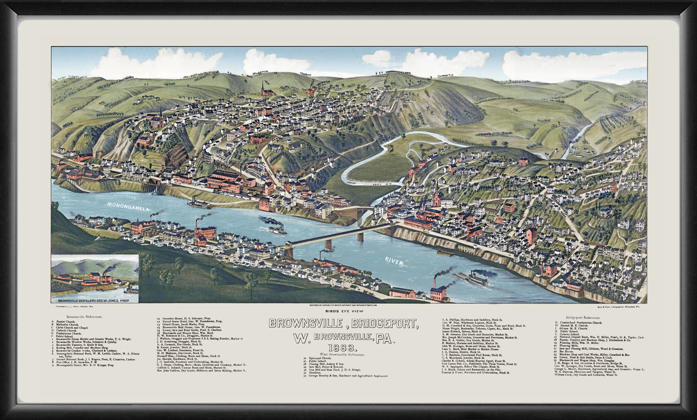 Restored bird’s eye view map of Brownsville, Bridgeport, and West Brownsville, Pennsylvania, 1883 by J.J. Stoner