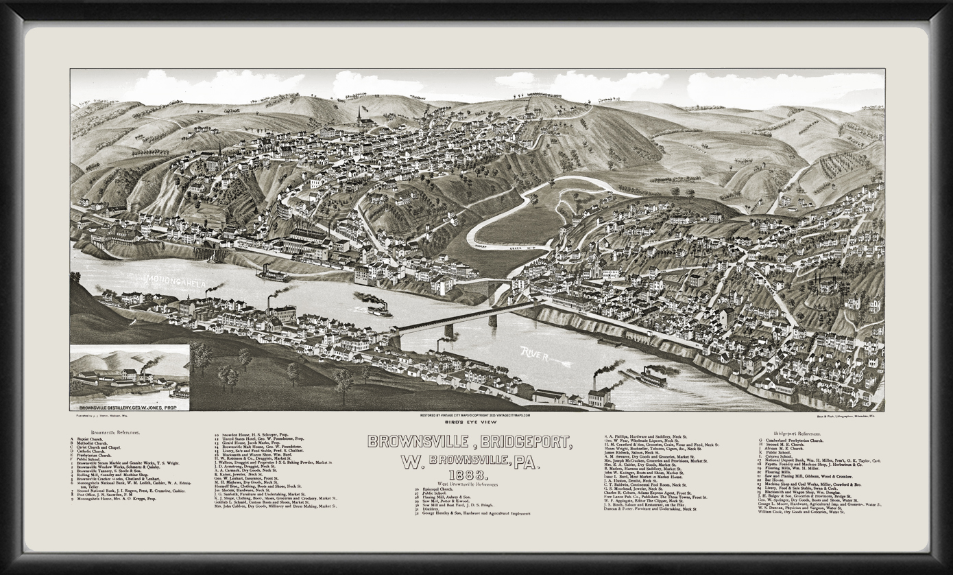 Restored bird’s eye view map of Brownsville, Bridgeport, and West Brownsville, Pennsylvania, 1883 by J.J. Stoner