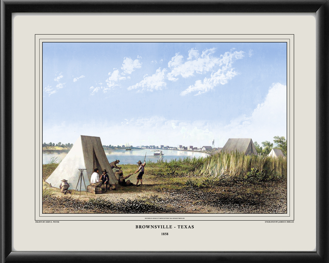 Restored panoramic view of Brownsville, Texas 1858 as seen by surveyors, drawn by John E. Weyss and engraved by James D. Smillie.