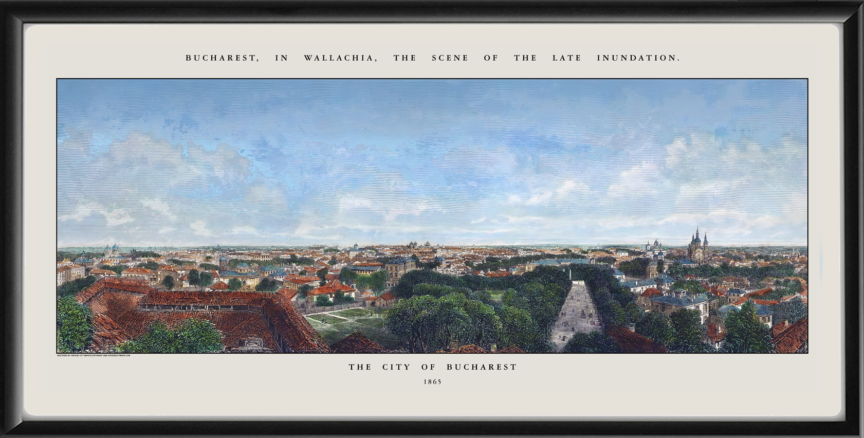 Restored panoramic view of Bucharest, Romania 1865, the scene of the late inundation, from the original engraving published in the Illustrated London News