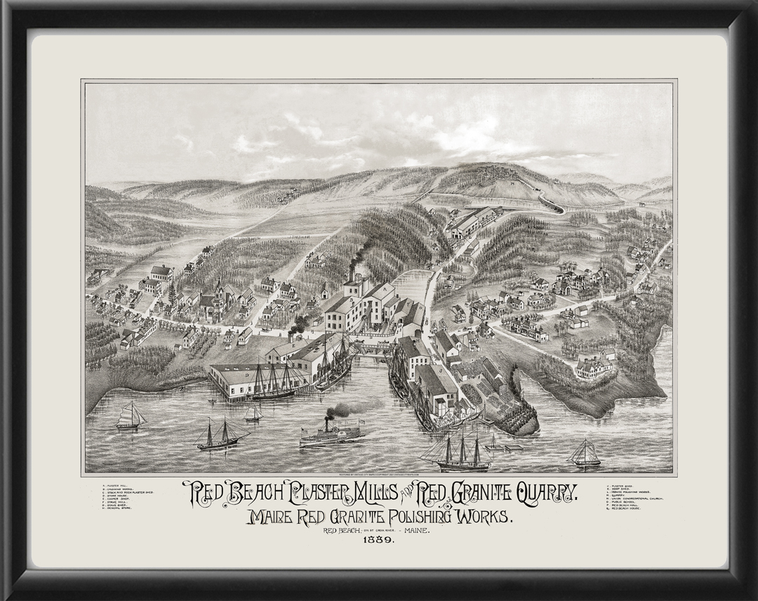 Restored bird’s eye view map of Calais, Maine – Red Beach Plaster Mills, Red Granite Quarry, and Red Granite Polishing Works, 1889 by Oakley Hoopes Bailey.