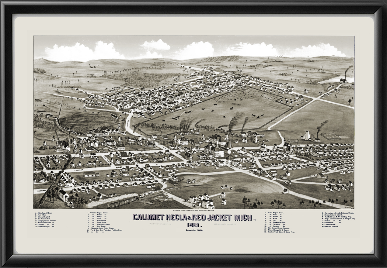 Restored bird’s eye view map of Calumet, Michigan, 1881 by Henry Wellge.