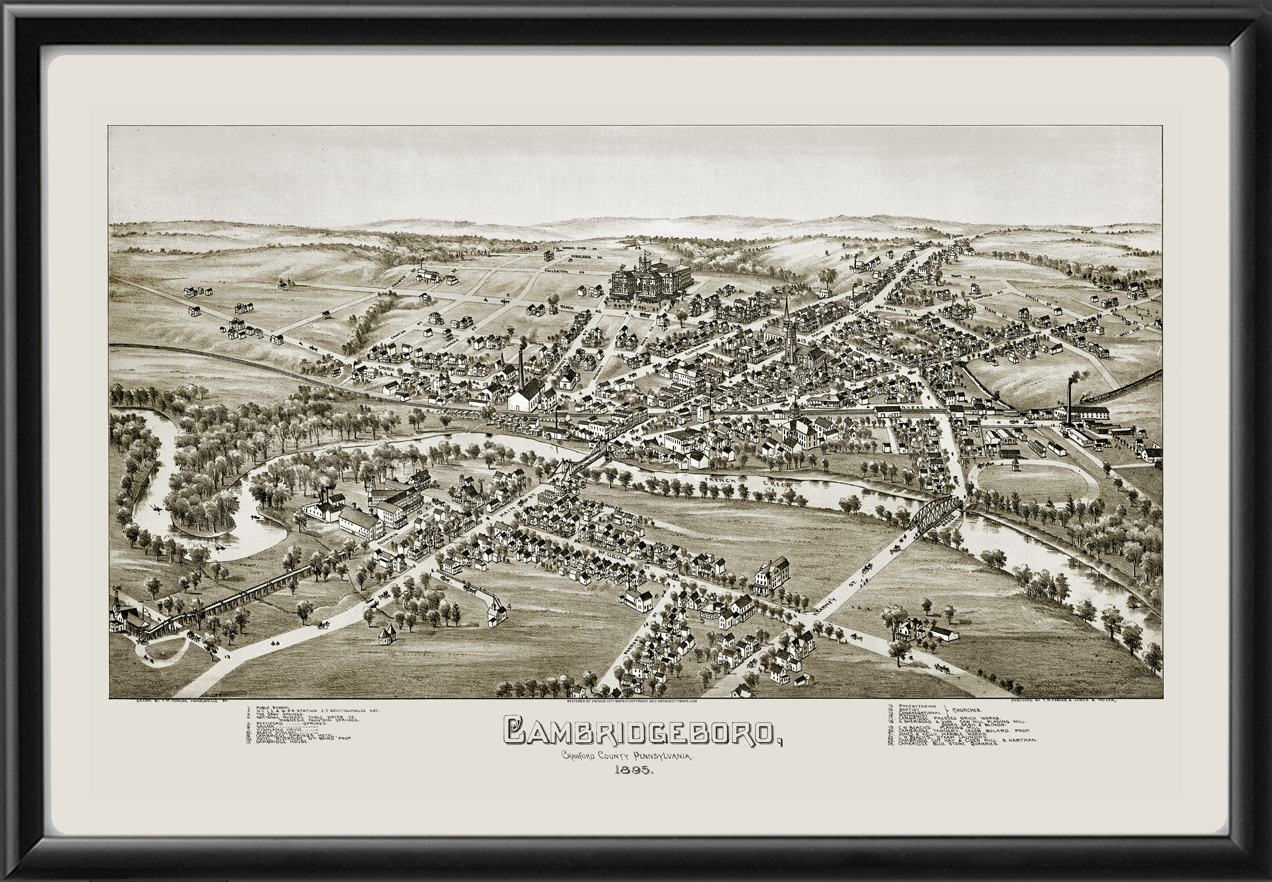 Restored bird’s eye view map of Cambridgeboro (now Cambridge Springs), Pennsylvania, drawn in 1895 by T.M. Fowler & James Moyer.