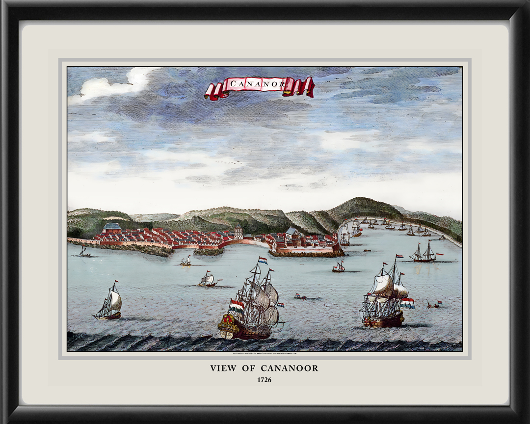 Restored east view of Cananoor (Kannur) India, 1726 from Oud en Nieuw Oost-Indien – Old and New East India – by François Valentijn