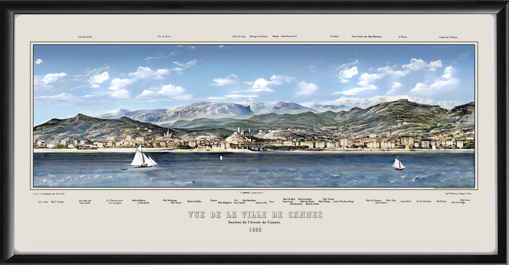 Restored panoramic view of the town of Cannes, France, 1866, from the original illustration by Victor Petit, published for the Société de l’Avenir de Cannes