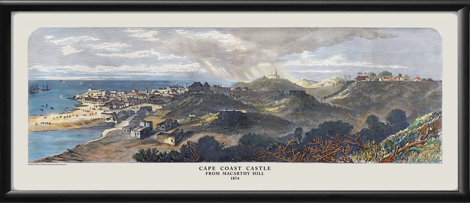 Restored panoramic view of Cape Coast Castle, Ghana, from Macarthy Hill, 1874 published by the Illustrated London News