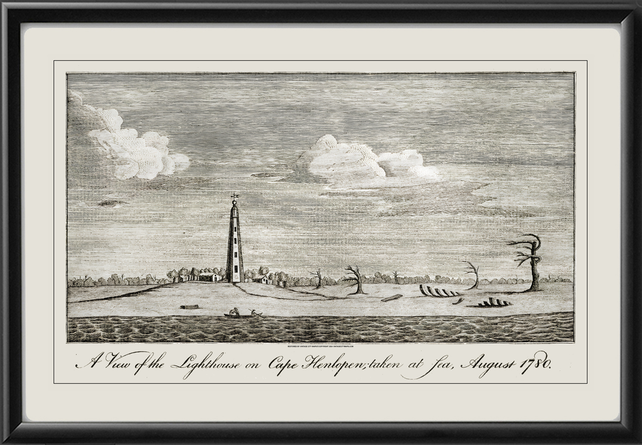 Restored view of the lighthouse at Cape Henlopen in Lewes, Delaware, 1780 from the original engraving published in Columbian Magazine